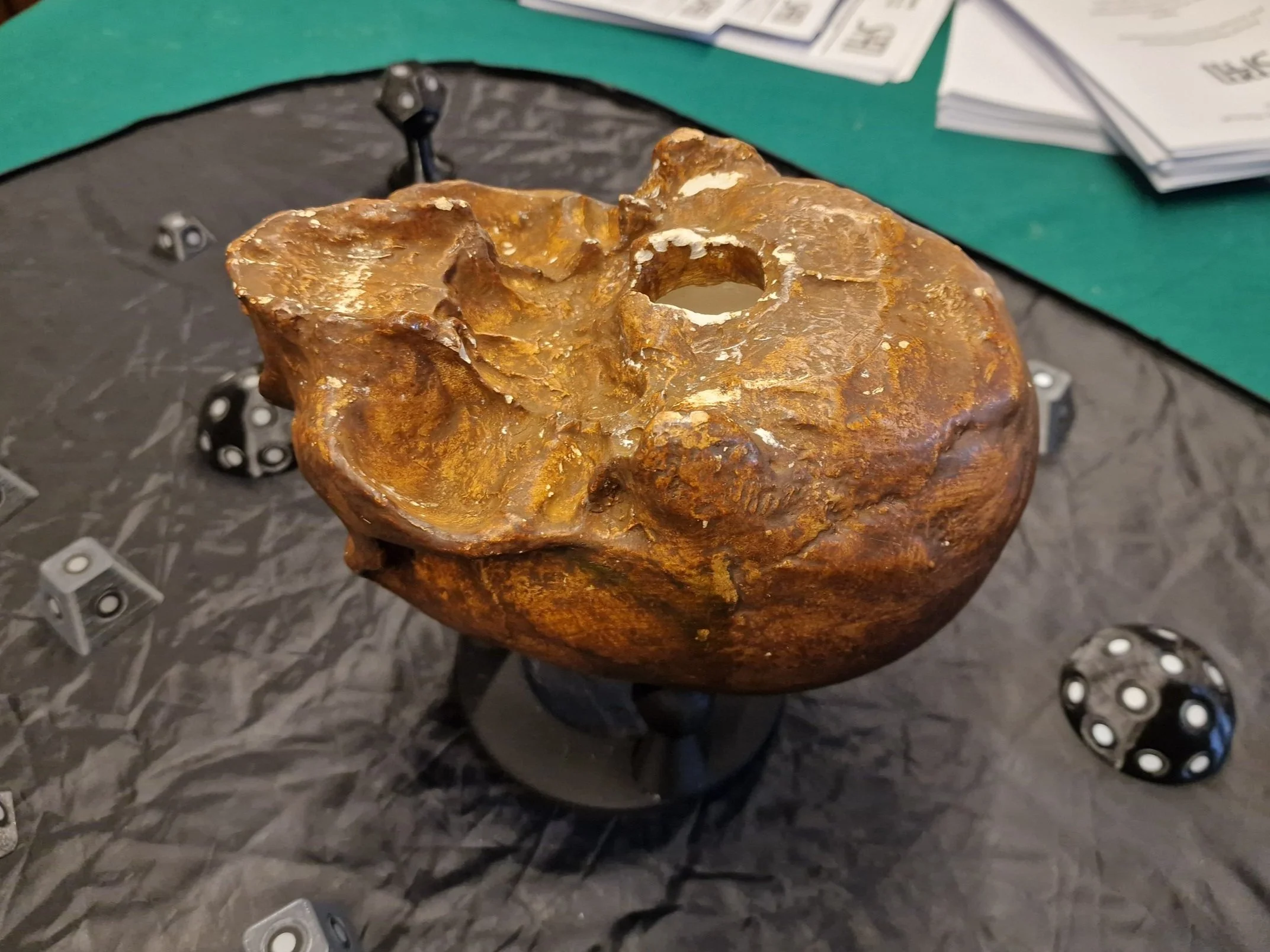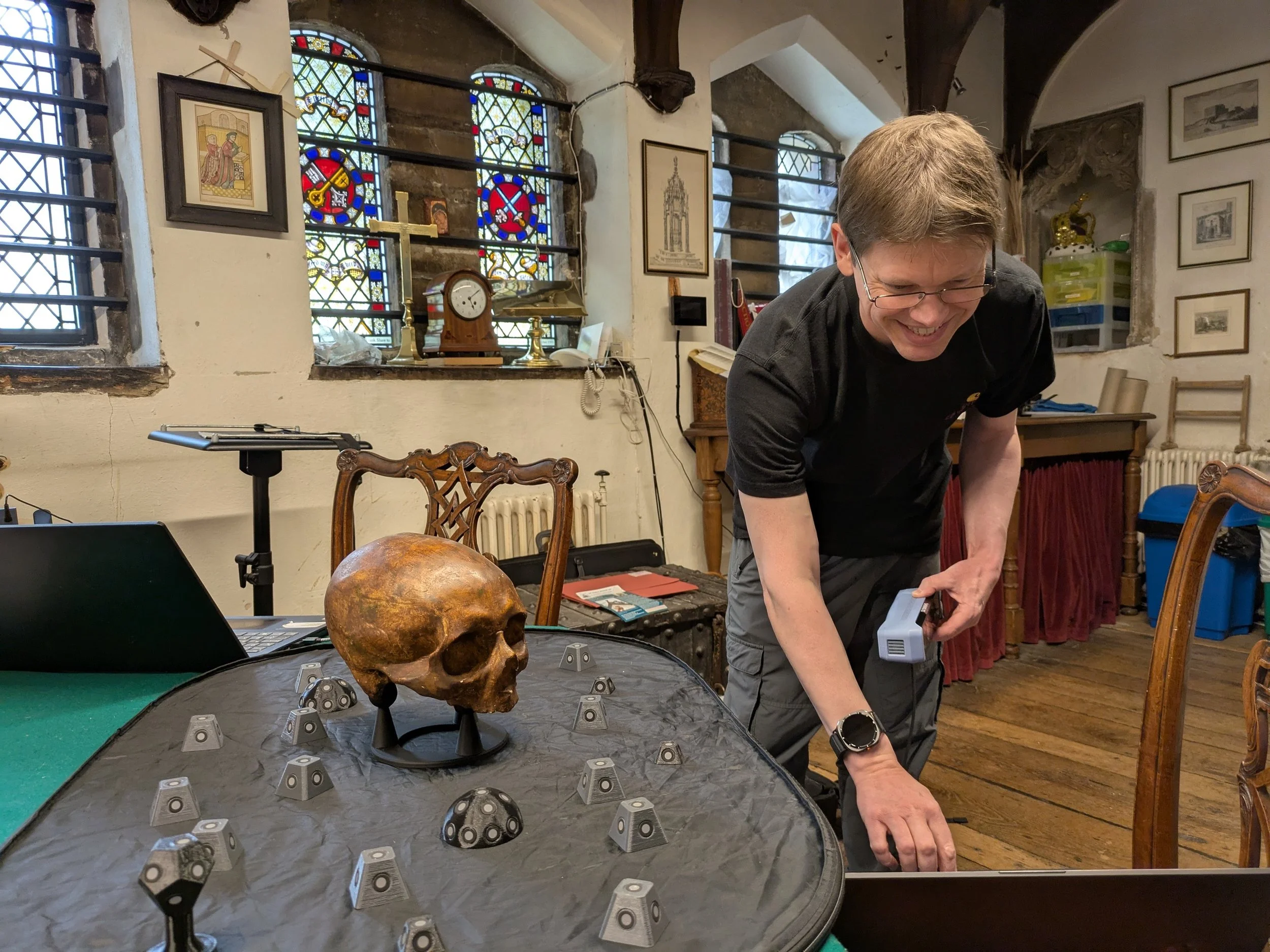 A custom 3d printed mount was created to support the skull while scanning to ensure no marks or damage, while also allowing access to all sides. Markers are used for tracking so multiple types are used to keep track even at low angles.
